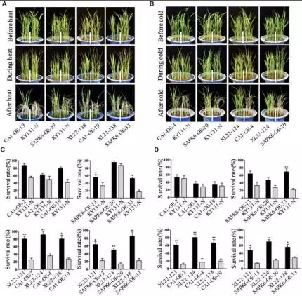 分別取XL22、CA1-OE、SAPK6-OE、KY-131-N的4葉齡種子材料,每個3個生物學(xué)重復(fù),均進行42℃ 12小時,4℃5天處理,最后正常環(huán)境下生長7天,觀察這各材料之間的葉卷曲清苦以及存活率,結(jié)果顯示,XL22表現(xiàn)為個更高的存活率(圖5C),更加輕微的葉片卷曲(圖4A),表明XL22相較于單基因轉(zhuǎn)化株與非轉(zhuǎn)基因株擁有更強的耐熱、抗寒能力。