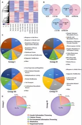 c)由于轉(zhuǎn)基因材料中過表達基因為bZIP家族轉(zhuǎn)錄因子及其活性激活基因家族,研究者重點關(guān)注了3個材料中轉(zhuǎn)錄上調(diào)的基因,這些基因被劃分為4類:Group1,XL22相較于CA1-OE特有上調(diào)基因,645個;Group2,XL22相較于SAPK6-OE特有上調(diào)基因,500個基因特異上調(diào);Group3,CA1-OE相較于SAPK6-OE特有上調(diào)基因,398個;Group4,SAPK6-OE相較于CA1-OE特有上調(diào)基因,869個。Group I主要分布在“Response to ABA”、“Regulation of Plant-type Hypersensitive response”等GO term;Group II主要分布在“Organic Substance Biosynthetic Process” 、“Salicylic Acid Biosynthetic Process” 、“Regulation of Hydrogen Peroxide Metabolic Process”等GO term;Group3主要分布在“Gene Expression and Regulation”、 “Nitrate Related Metabolic Process” 、 “Carbohydrate Biosynthetic Process” 等GO term;Group4主要分布在 “Cytokinesis and Cell Proliferation”、“Microtubule Related Process”、“Response to Abiotic Stress” 等GOterm(見圖6C)。因此推測,XL22中的兩個基因可能激活了不同的干旱脅迫應(yīng)答基因。
