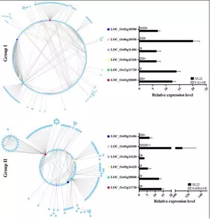 d)為了揭示GroupI 、Group2兩個基因集內(nèi)部的基因調(diào)控關(guān)系,研究者基于STRING數(shù)據(jù)庫分別繪制了上述兩個基因集內(nèi)部基因的蛋白互作網(wǎng)絡(luò)圖。如圖7所示,GroupI蛋白互作網(wǎng)絡(luò)中包含481個PPI(protein-protein intereaction,PPI),Group2中包含280個PPI。其中,有6個基因在蛋白互作網(wǎng)絡(luò)中均處于非常中心的位置(與之互作蛋白數(shù)量越多,越靠近中心位置)。其中,3個(LOC_Os12g13720, ?LOC_Os03g58800, ?LOC_Os09g31486) 在兩個蛋白互作網(wǎng)絡(luò)中均處于中心位置,分別編碼 PDR ABC transporter, a ATPase, and a DnaK/Hsp70s family protein,可能在干旱應(yīng)答過調(diào)控網(wǎng)絡(luò)發(fā)揮著非常關(guān)鍵的;其他3個基因(Group1特異:LOC_Os04g42260 ?LOC_Os02g38580,Group2特異:LOC_Os05g03050)分別編碼protein phosphatase、Rad51、Hsp90 ,從功能可以看出,它們與水稻干旱應(yīng)答同樣相關(guān)。