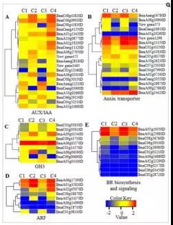 d)對(duì)兩個(gè)時(shí)間點(diǎn)所有差異基因進(jìn)行KEGG通路分析,其中3297個(gè)基因注釋到了KEGG數(shù)據(jù)庫(kù) ,其中大多數(shù)基因注釋到了 ribosome 、oxidative phosphorylation相關(guān)代謝通路。值得注意的是,在兩個(gè)時(shí)間點(diǎn)分別有58、51個(gè)差異基因注釋到了植物激素信號(hào)通路,進(jìn)一步分析發(fā)現(xiàn),這些通路大多為BR或auxin信號(hào)轉(zhuǎn)導(dǎo)通路。該部分結(jié)果如圖3所示。