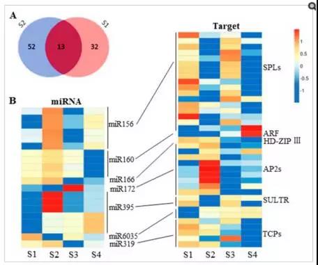 大部分的miRNA與其對(duì)應(yīng)的靶基因在表達(dá)量上均呈負(fù)相關(guān),比如, miR156 在Purler品系中轉(zhuǎn)錄上調(diào), 其對(duì)應(yīng)的大部分的 靶向 SPL 基因在Purler品系中表現(xiàn)為下調(diào); ?miR395 與miR319 在Purler品系中轉(zhuǎn)錄上調(diào) ,其對(duì)應(yīng)的靶基因包括 Sulfate Transporter (SULT) 、TEOSINTE-BRANCHED/CYCLOIDEA/PCF (TCP)表現(xiàn)為相反的趨勢(shì),這些結(jié)果說(shuō)明,本研究中的mRNA-seq、microRNA-seq結(jié)果均比較可靠。轉(zhuǎn)錄水平表現(xiàn)為相反趨勢(shì)的的miRNA-gene 可用于后期進(jìn)一步更加深入的挖掘油菜分枝背后的microRNA-mRNA調(diào)控網(wǎng)絡(luò)。