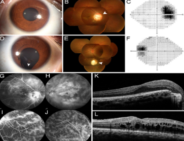 患者是一名14歲男性,攜帶常染色體隱性遺傳病,生于近緣家族,全面眼科檢查顯示其最近左眼視力逐漸喪失,雙眼出現(xiàn)輕微白內(nèi)障癥狀。眼前段裂隙燈檢查顯示右眼正常(圖1A),但左眼6點鐘方向虹膜缺損(圖1D)。眼底檢查右眼視神經(jīng)盤缺損(圖1B),左眼脈絡膜缺損(圖1E)。在視覺范圍上,右眼生理盲區(qū)擴大(圖1C),雙眼視覺對比敏感度低(圖1C,F(xiàn))。其他家庭成員沒有OC或眼部畸形。除OC表型外,眼底熒光血管造影(FFA)和光學相干斷層掃描(OCT)結(jié)果提示患雙側(cè)視網(wǎng)膜血管炎和繼發(fā)性視網(wǎng)膜劈裂癥(圖1G,H,K和L)。接受2個月激素治療后,雙眼黃斑水腫逐漸消失(圖1I和J)。