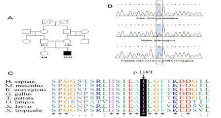 圖3?RAX突變鑒定(A.譜系遺傳;B.Sanger驗證;C.RAX基因?Ile38?氨基酸殘基進化保守性)
