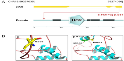 變異型分析的詳細過程(圖2A)。變體數(shù)據(jù)庫中排除次要等位基因頻率(MAF)>0.005的變異型。純合子分析顯示有12個大于2?Mb的純合子位點(圖2B)。在使用逐步篩選策略后,發(fā)現(xiàn)在純合子區(qū)域有3個候選變異型(RAX、TRPM5、PCDH17)。在家族成員中擴大檢測后篩選得到一個RAX錯義突變(c.113?T>?C,p.I38T)。且在dbSNP137、1000 Genome、ESP6500、內(nèi)部數(shù)據(jù)庫、ExAC數(shù)據(jù)庫中沒有此錯義突變(圖3A-B)。