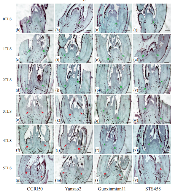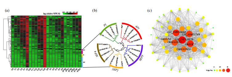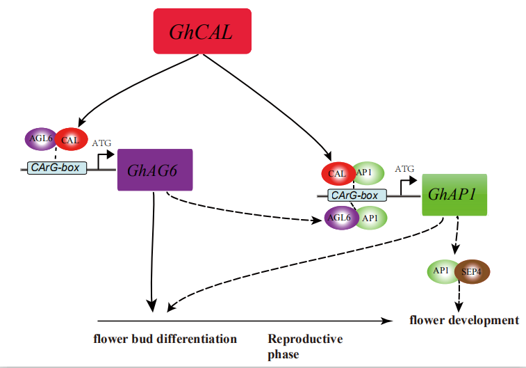 在早熟品種中,GhCAL在3TLS表達(dá)。GhCAL與GhAGL6-D09形成異二聚體,可能與GhAGL6-D09啟動(dòng)子區(qū)域的CArG-box結(jié)合并誘導(dǎo)GhAGL6-D09的表達(dá)以啟動(dòng)花芽分化。在5TLS時(shí),GhCAL / GhAGL6與GhAP1-A04形成異二聚體,可能與GhAP1-A04啟動(dòng)子區(qū)域的CArG-box結(jié)合并誘導(dǎo)GhAP1-A04的表達(dá)。GhCAL充當(dāng)整個(gè)途徑的調(diào)節(jié)中心,調(diào)節(jié)棉花從營養(yǎng)期到生殖期的過渡,以誘導(dǎo)開花。