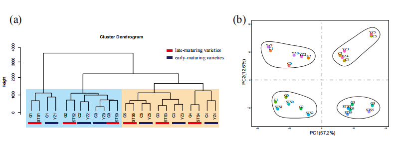首先作者挑選兩個(gè)早熟,兩個(gè)晚熟材料進(jìn)行表型調(diào)查和轉(zhuǎn)錄組測(cè)序后,拿到所有基因表達(dá)量數(shù)據(jù)后對(duì)表達(dá)量篩選,做了聚類圖和PCA,發(fā)現(xiàn)根據(jù)表達(dá)量可以把不同性狀、不同發(fā)育時(shí)期進(jìn)行分類。