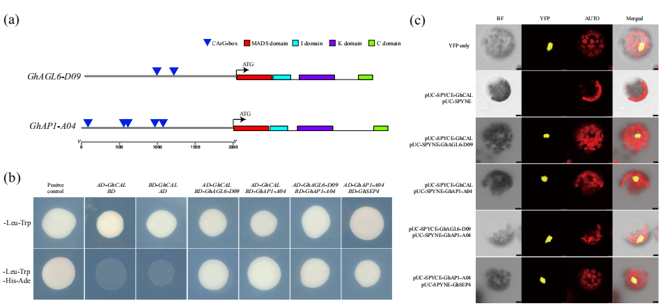 先前的研究表明,某些MADSbox轉(zhuǎn)錄因子可能形成異二聚體以發(fā)揮調(diào)節(jié)作用。酵母雙雜交(Y2H)和雙分子熒光互補(bǔ)(BiFC)分析表明,GhCAL,GhAGL6-D09和GhAP1-A04這三種蛋白質(zhì)彼此相互作用,形成異二聚體。在擬南芥中,MADS-box轉(zhuǎn)錄因子可以形成特異性異二聚體,該異源二聚體與自身啟動(dòng)子區(qū)域的CArG-box結(jié)合并調(diào)節(jié)其自身表達(dá)。GhCAL可能與GhAGL6-D09和GhAP1-A04形成異源二聚體,結(jié)合啟動(dòng)子區(qū)域的CArG-box,然后調(diào)節(jié)它們的表達(dá)。