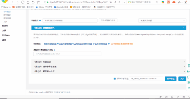 參數(shù)設(shè)置完成之后,可以點(diǎn)擊保存參數(shù),方便之后進(jìn)行重新分析或者基于本次參數(shù)進(jìn)行修改后再次分析;一切準(zhǔn)備就緒后,點(diǎn)擊提交將任務(wù)提交到百邁客云計(jì)算集群上,根據(jù)不同分析平臺(tái)、不同數(shù)據(jù)量等待大概2小時(shí)到3周的時(shí)間完成項(xiàng)目分析,獲取到標(biāo)準(zhǔn)分析報(bào)告。