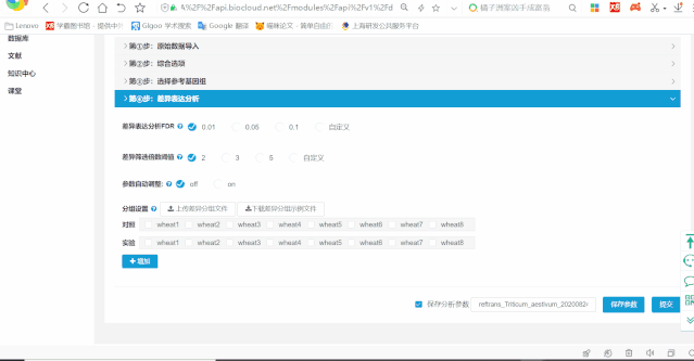 1. 分組設(shè)置:有幾組生物學(xué)重復(fù)就在左側(cè)的分組池中添加相應(yīng)數(shù)量的分組,再從右側(cè)的樣品池中選樣本加入相應(yīng)的分組中,1個(gè)樣本只能屬于一個(gè)分組且一個(gè)分組的樣本數(shù)目不少于2個(gè)。(這里需要修改分組名稱,分析完成后不可修改)